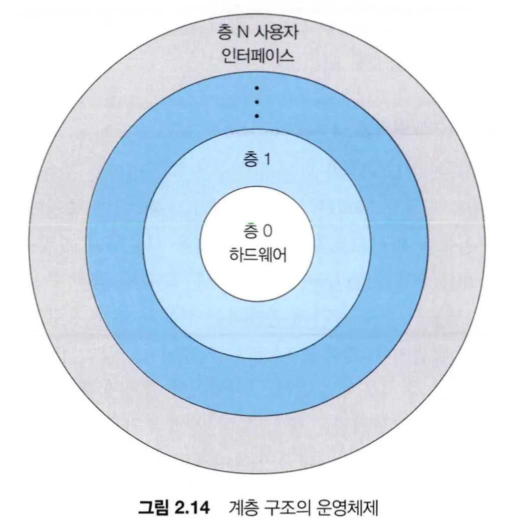 운영체제 층은 하위층에 대한 연산을 호출할 수 있고, 자료구조와 상위층에서 호출할 수 있는 루틴의 집합으로 구성된다. 각 층은 자신보다 하위 수준의 층에 의해 제공된 연산만을 사용해 구현되고, 하위 층의 연산이 어떻게 구현되었는지 알 필요가 없다.