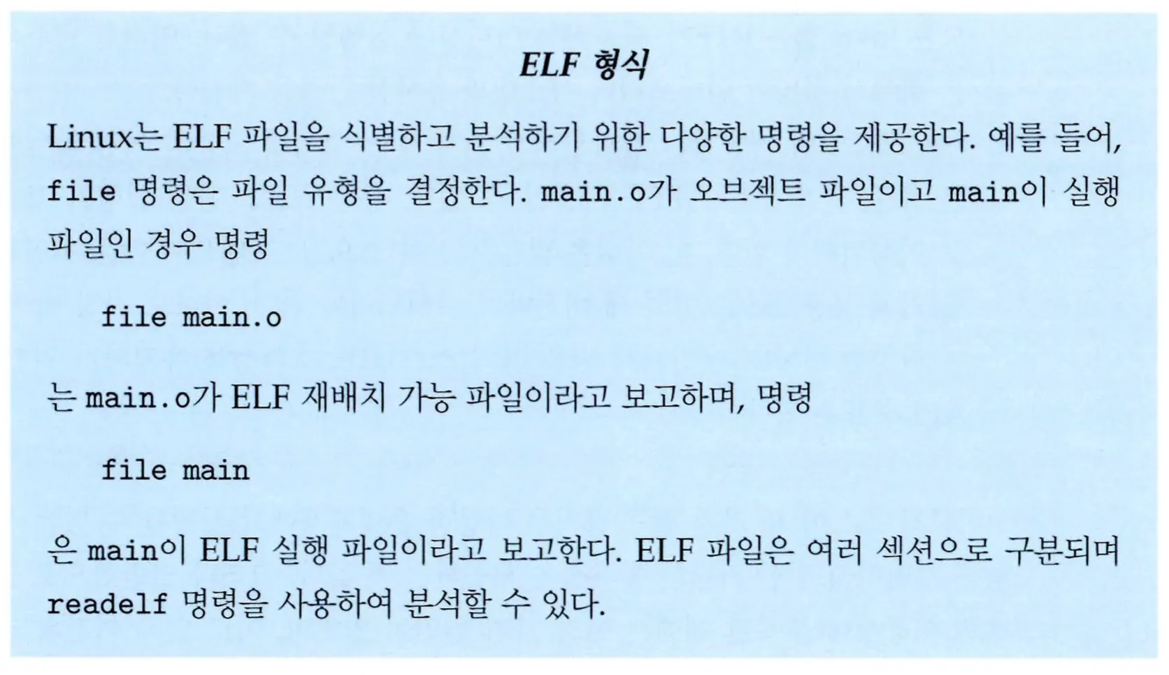 오브젝트 파일과 실행 파일은 일반적으로 표준화된 형식을 가지는데, UNIX 및 Linux 시스템에서는 이 표준 형식을 ELF(Excutalbe and Linkable Format)이라 부른다. 재배치 가능 파일과 실행 파일 각각을 위한 별도의 ELF 형식이 사용된다. Windows 시스템은 PE(Portable Executable), macOS는 Mach-O 형식을 사용한다.