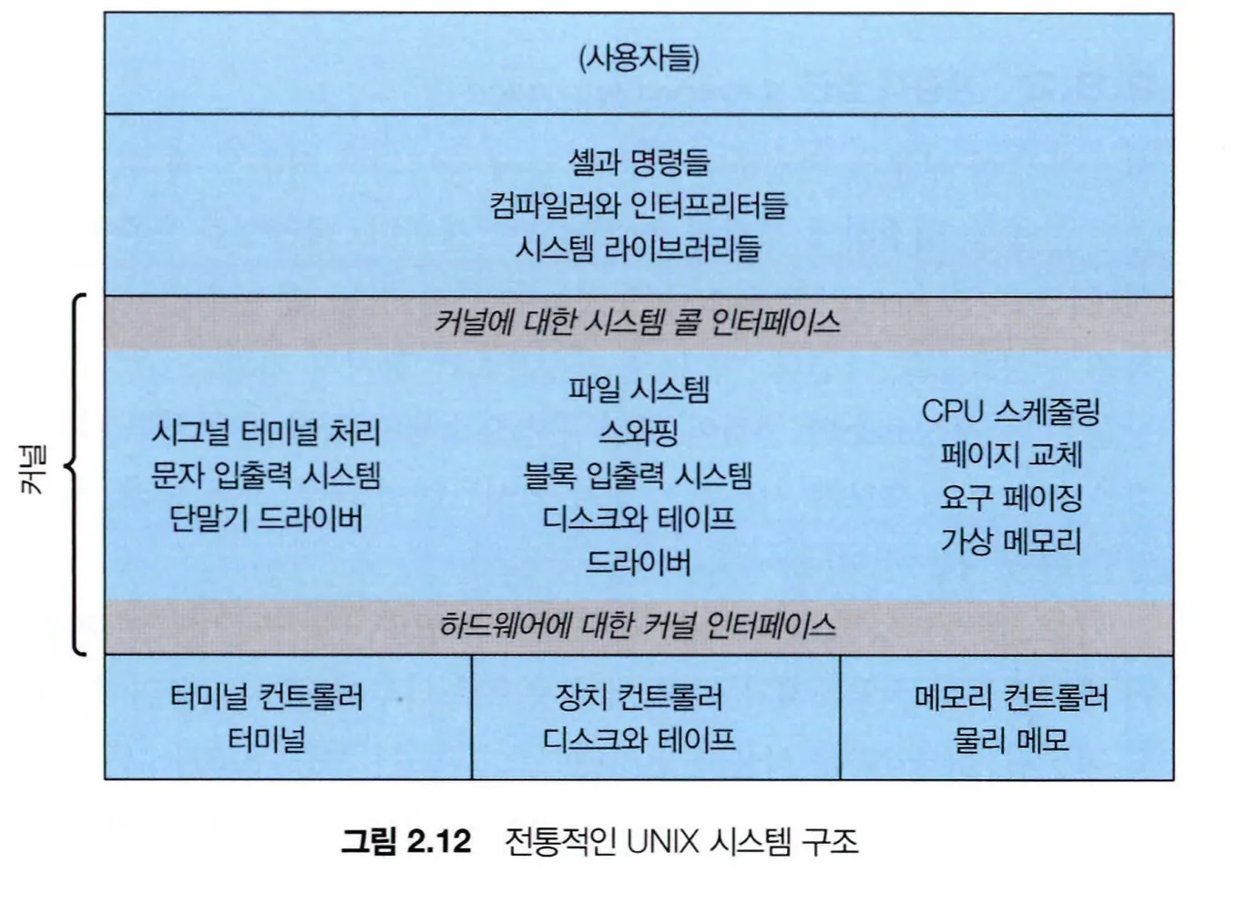 최초의 UNIX 운영체제가 모놀리식 구조이며, 커널과 시스템 프로그램의 두 부분으로 구성된다.