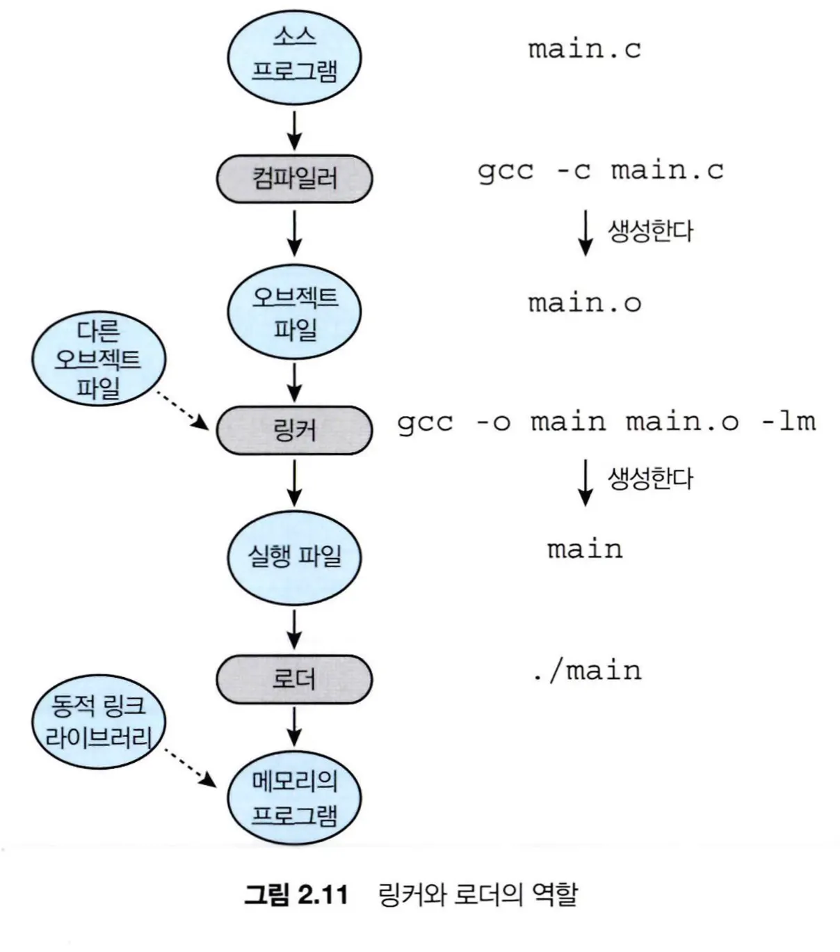 소스 파일은 임의의 물리 메모리 위치에 로드되도록 설계된 재배치 가능 오브젝트 파일로 컴파일되고, 링커는 이 재배치 가능 오브젝트 파일을 하나의 이진 실행 파일 형태로 결합한다. 로더는 이진 실행 파일을 메모리에 로드하여 CPU 코어에서 실행할 수 있는 상태로 만든다.