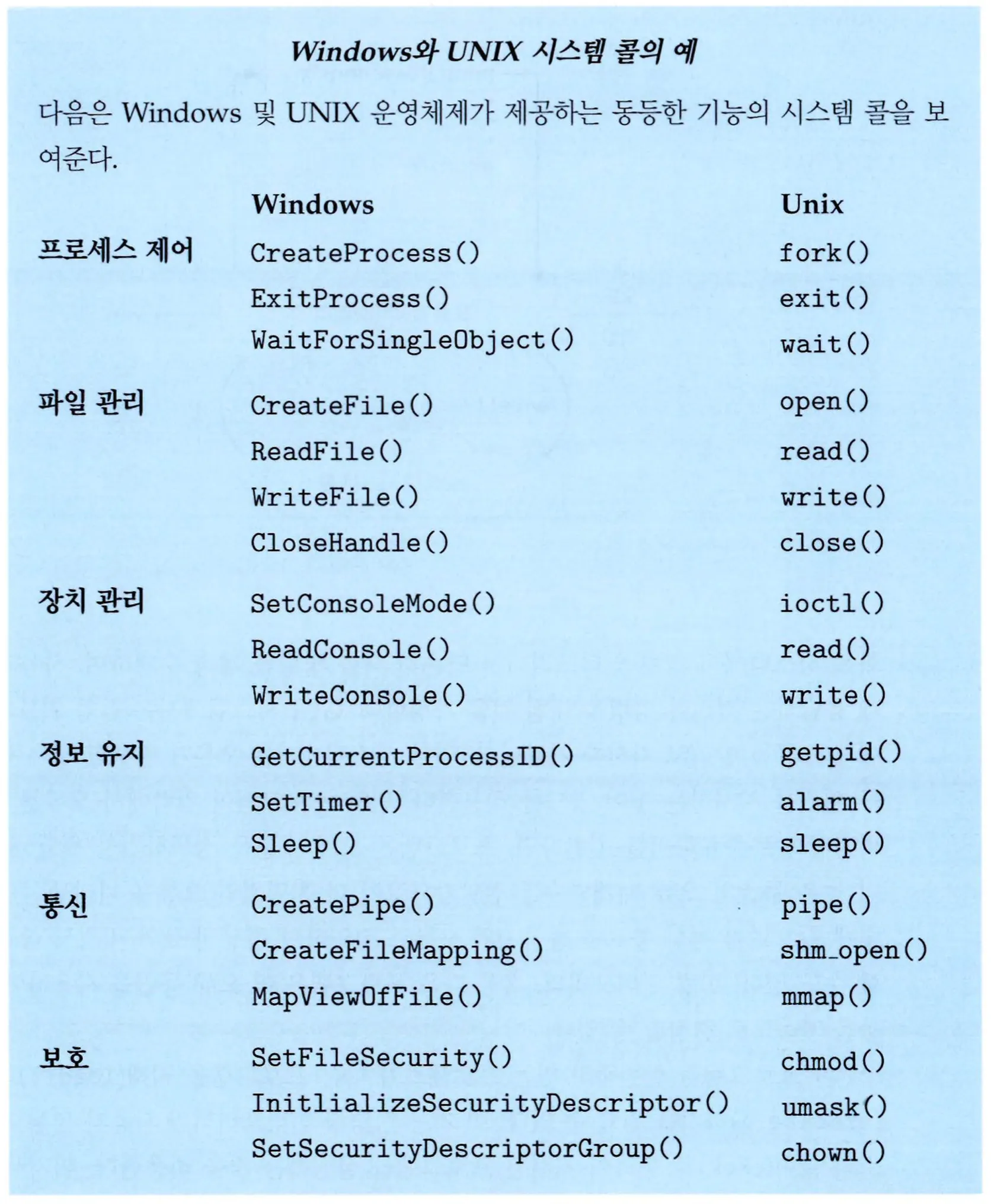 API를 구성하는 함수들은 프로그래머를 대신해서 시스템 콜을 호출한다. 예시를 들면, Windows 함수인 CreateProcess() 함수는 실제로 Windows 커널의 NTCreateProcess() 시스템 콜을 호출한다.