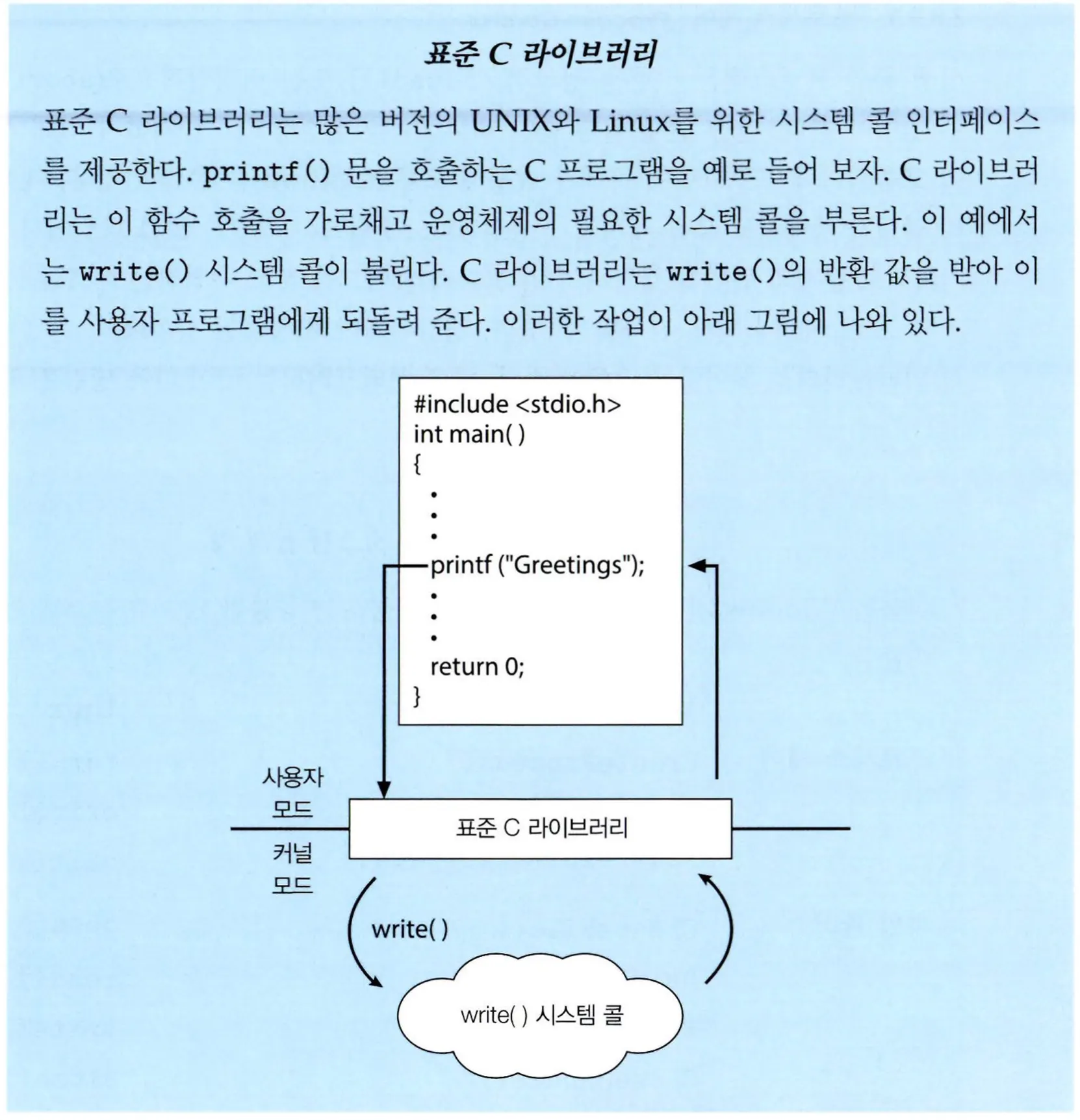 응용 프로그램은 open(), read(), write(), fork(), exec()와 같은 C나 C++에서 제공하는 라이브러리 함수를 사용하여 시스템 콜을 호출한다