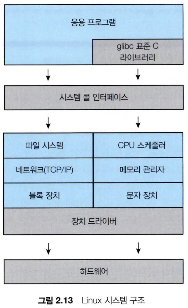 Linux 운영체제는 아래와 유사하게 구성되는데, Linux 커널은 단일 주소 공간에서 커널 모드로 전부 실행된다는 점에서 모놀리식이지만, 런타임 중에 커널을 수정할 수 있는 모듈식 설계를 갖추고 있다.