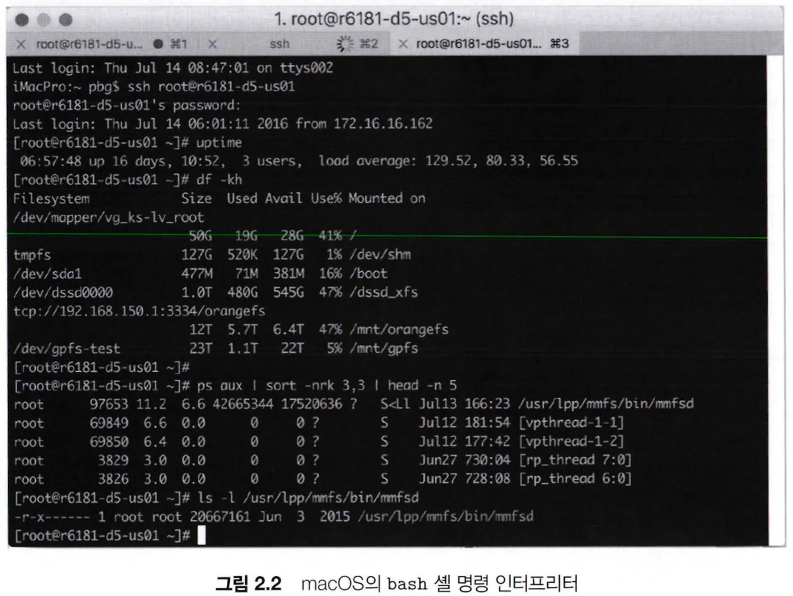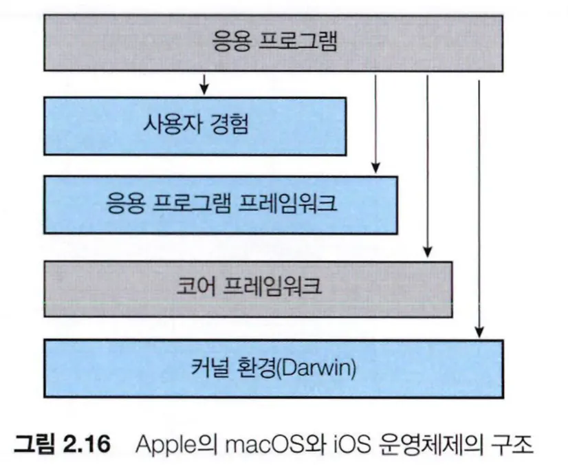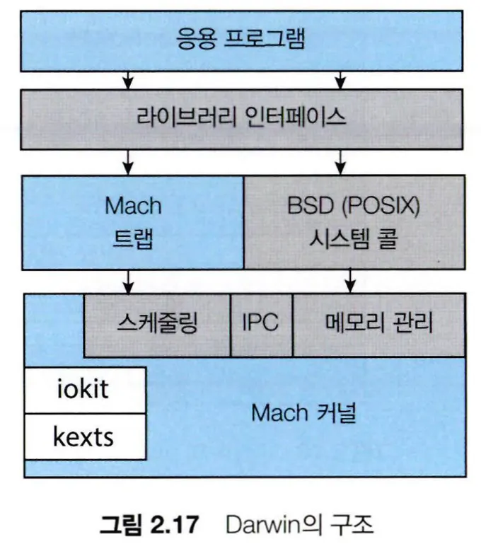 Darwin이라고도 불리며, Mach 마이크로커널과 BSD UNIX 커널로 구성된 계층화된 시스템이다.