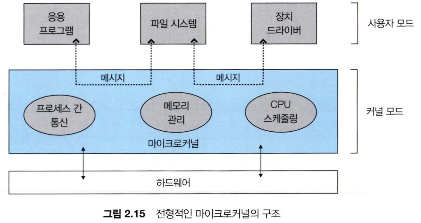 마이크로 커널 접근 방식은 모놀리식 구조에서 커널의 중요치 않은 구성요소를 커널에서 제거하고 별도의 주소 공간에 사용자 모드 프로그램으로 구현하는 방식이다.
