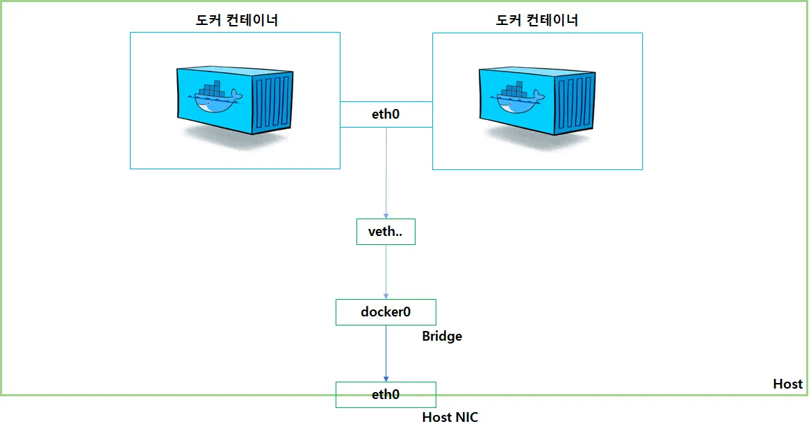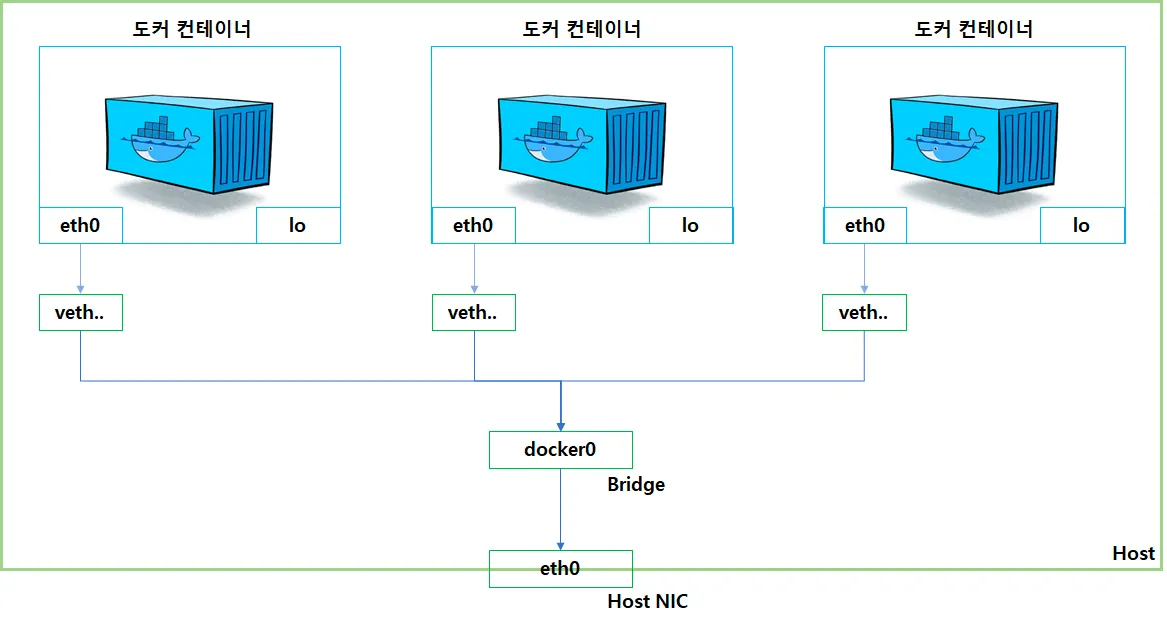 도커는 컨테이너에 NAT 내부 IP를 순차적으로 할당하며, 내부 IP는 컨테이너를 재시작 할 때마다 변경될 수 있다. 도커는 NAT를 외부와 연결하기 위해 컨테이너를 시작할 때마다 도커 엔진에서 호스트에 veth(Virtual Ethernet)라는 네트워크 인터페이스를 생성하여, docker0 브릿지와 바인딩하여 호스트의 NIC(Network Interface Card)로 eth0 인터페이스와 연결한다.