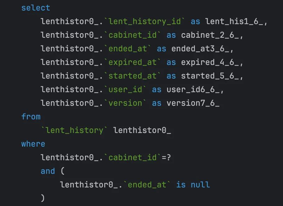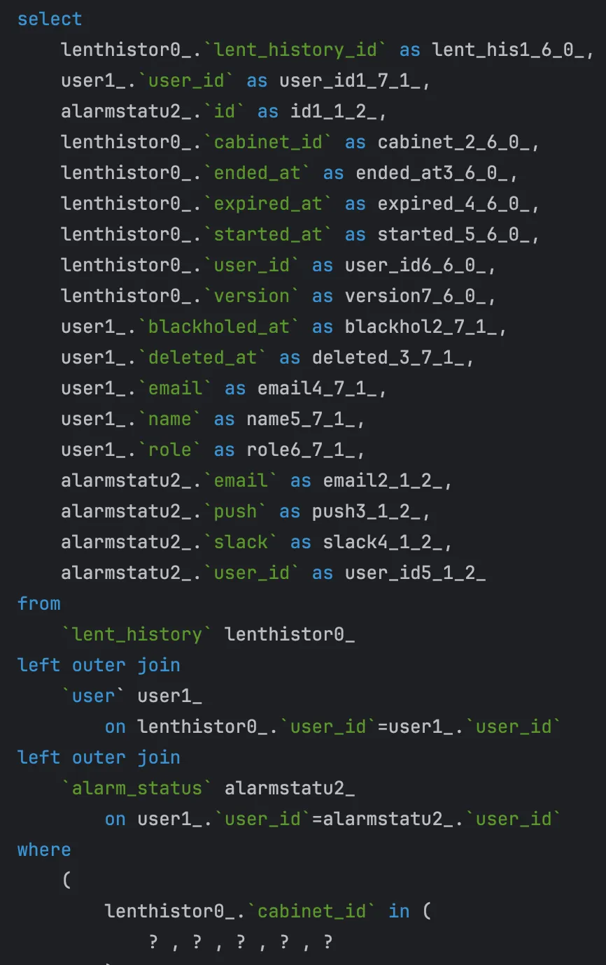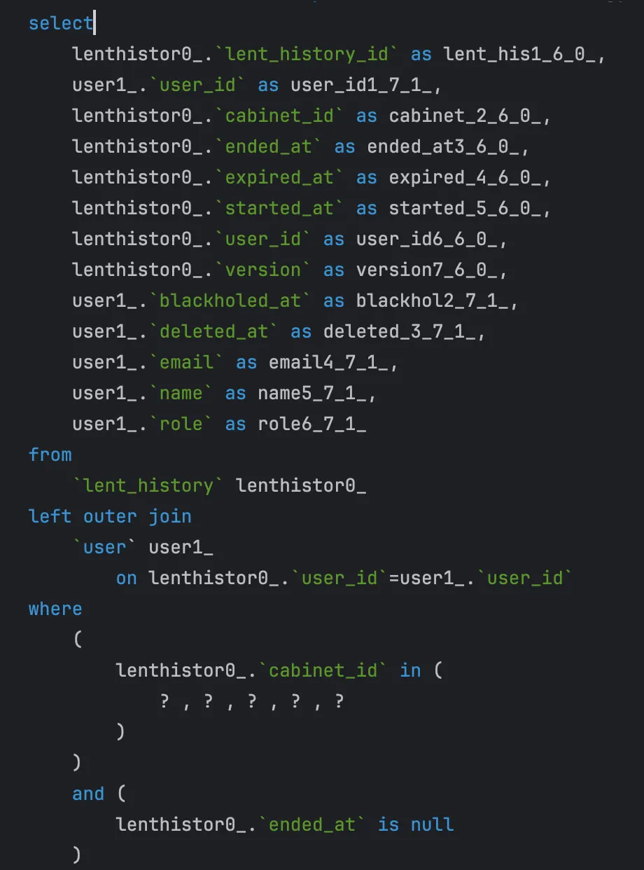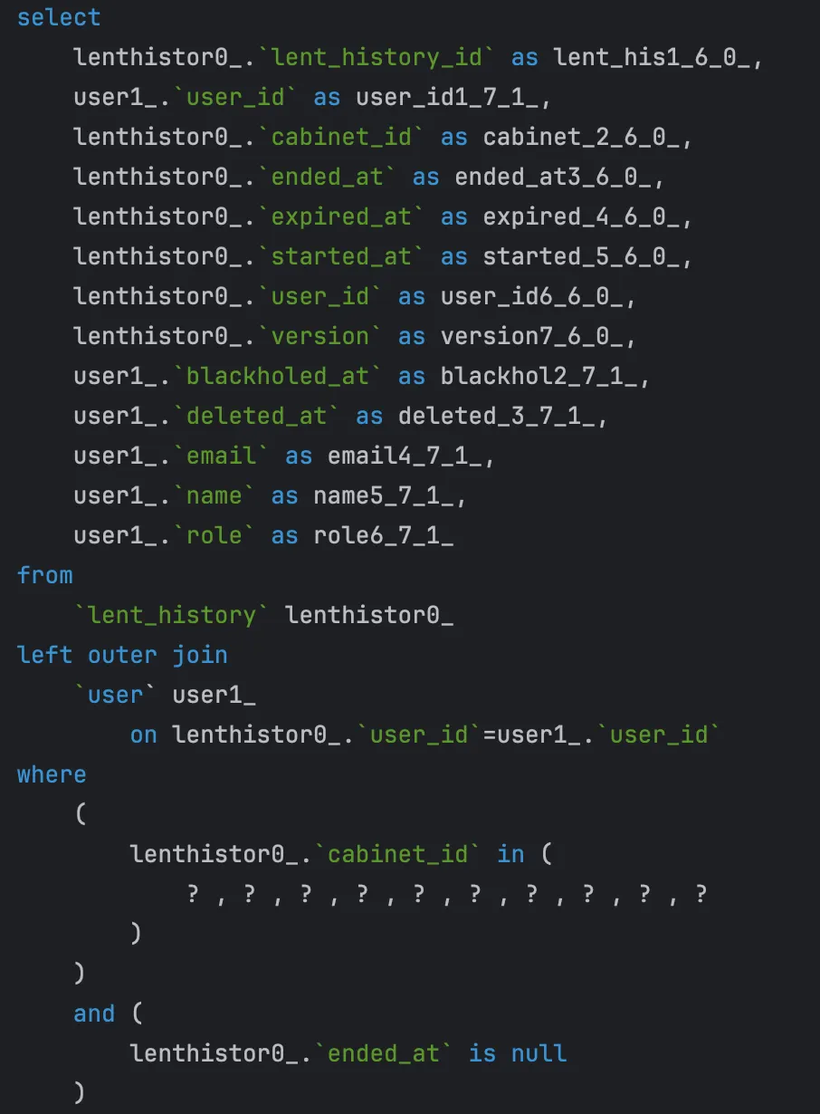 여러 CabinetId를 IN 구문으로 한번에 lentHistory 전부 조회해오는 것을 확인할 수 있다.