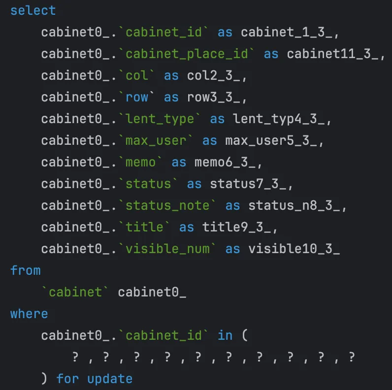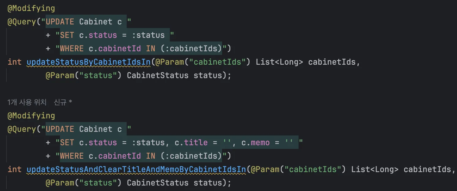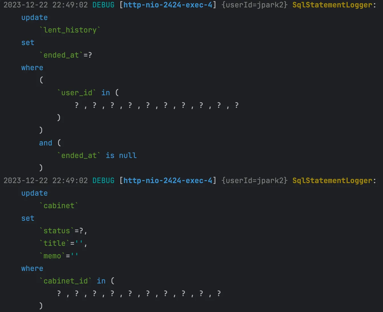 일단 코드 자체에서 List로 여러 cabinetId들로 Cabinet들을 조회한 이후, 조회한 Cabinet들을 순회하며 LentHistory를 가져와 각각의 Cabinet을 반납 및 상태 변경한다. 일단 코드의 로직 자체에서 N + 1로 쿼리 발생하는 구조로 작성되어 있다.