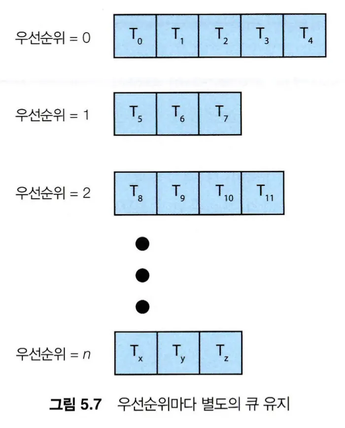 스케줄링 큐를 단일 큐에 두고 그 중 검색이나 선택을 하는 것이 아니라, 우선순위가 다른 여러 개의 큐를 단계적으로 두고 남은 프로세스 중 우선순위가 가장 높은 큐에서만 꺼내서 사용하는 방법이다. 같은 큐 내에서는 라운드-로빈 방식으로 동작한다.