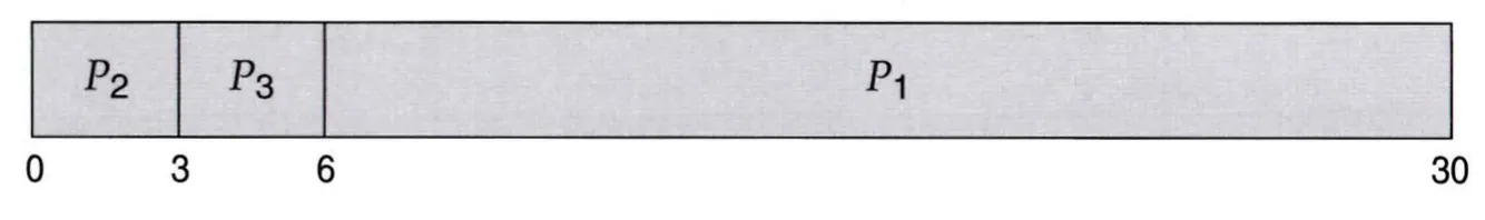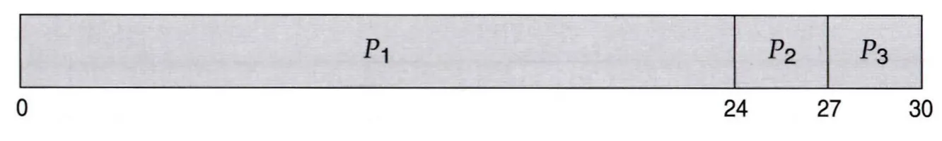 프로세스 P1은 24 ms, P2는 3 ms, P3가 3 ms의 버스트 시간을 가지고 1, 2, 3의 순으로 CPU 요청한 상황이다.