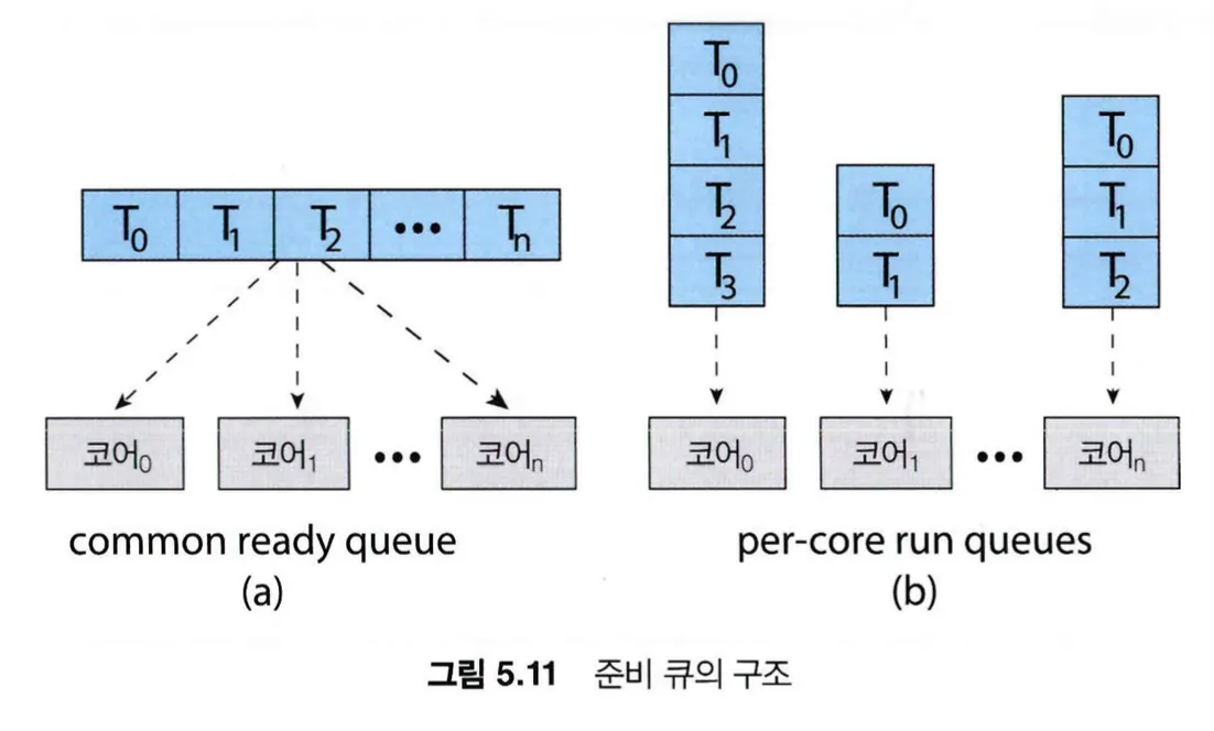 대칭 다중 처리 방식에서 스레드의 대기 큐는 하나의 큐를 통해 관리하는 방법과 각 프로세서마다 큐를 가지고 관리하는 방법이 있다.