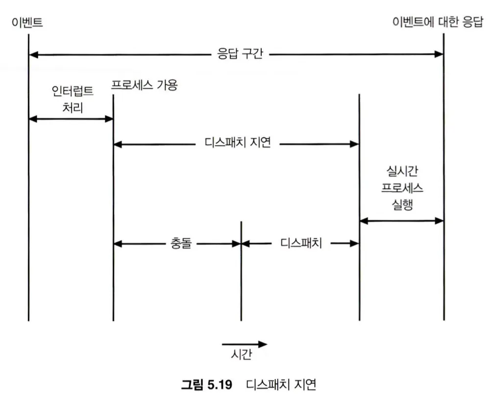 디스패치 지연시간 : 스케줄링 디스패처가 하나의 프로세스를 블록시키고 다른 프로세스를 실행시키기까지 걸리는 시간