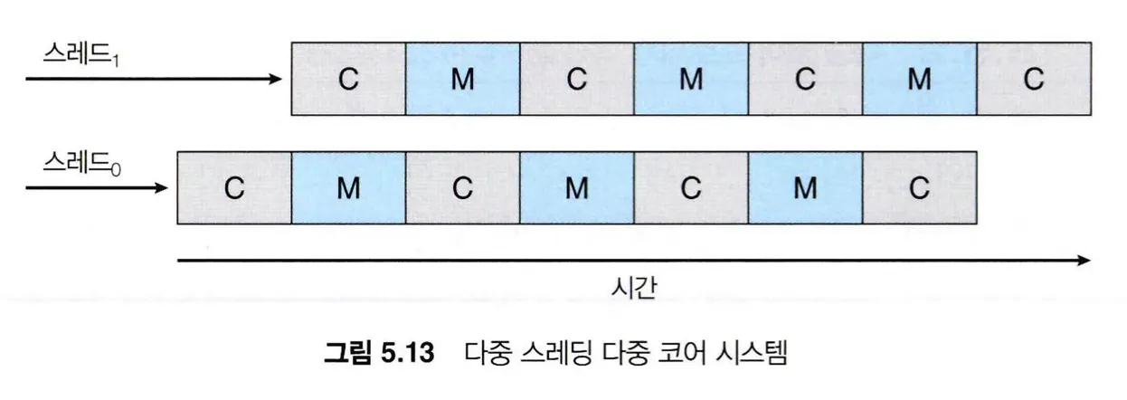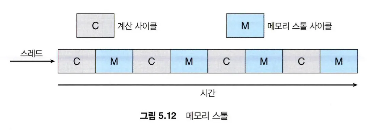 이런 상황을 해결하기 위해, 하나의 코어에 2개 이상의 하드웨어 스레드를 할당하여 메모리를 기다리는 동안 코어가 다른 하드웨어 스레드로 전환한다.