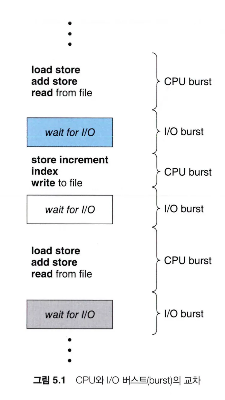 프로세스가 실행되면 연산과 작업의 처리 위주의 CPU 버스트가 시작되고, 입출력 장치를 사용하게되면 I/O 버스트가 발생하고, 다시 CPU 버스트가 발생하고의 반복이다.