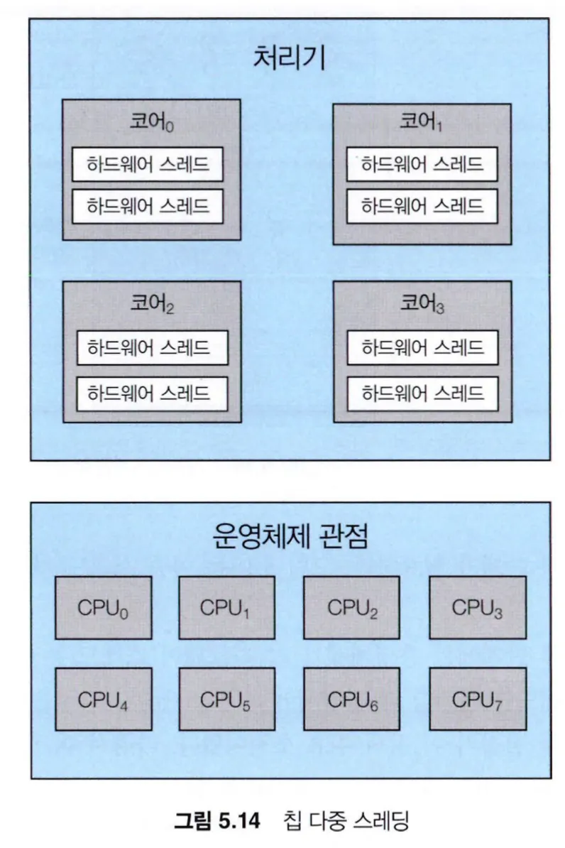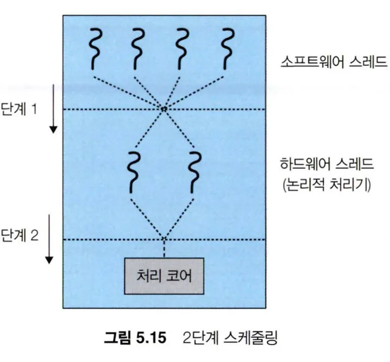 물리적인 처리 코어는 한 번에 하나의 하드웨어 스레드만 실행할 수 있기 때문에, 실질적으로 다중 스레드 다중 코어 프로세서는 2단계 스케줄링이 필요하다.