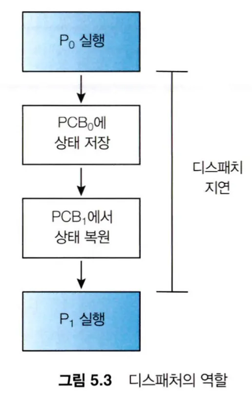 디스패치는 문맥 교환 시마다 호출되는데, 디스패처가 하나의 프로세스를 정지하고 다음 프로세스를 실행하기까지 소요되는 시간을 디스패치 지연(dispatch latency)이라 한다.