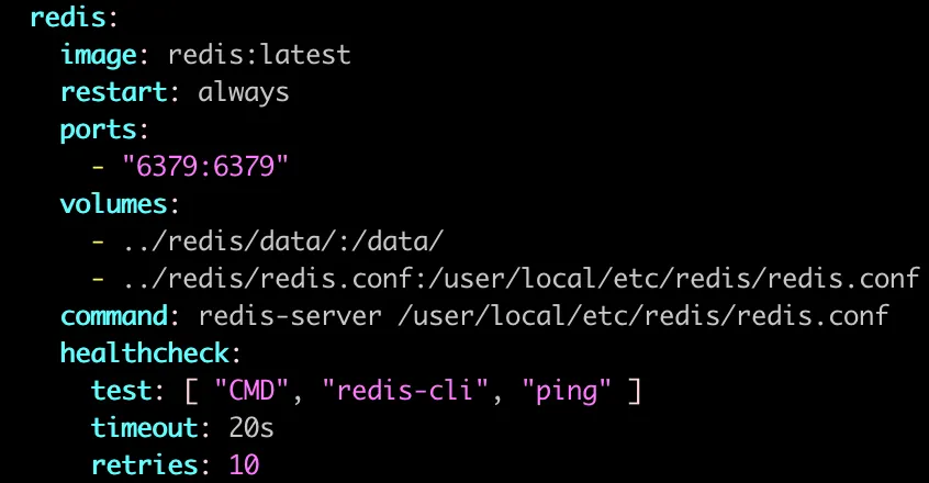 RDB와 AOF 파일이 컨테이너 내부에 저장해둔다면 redis 서버가 내려가면 백업 데이터도 같이 삭제되므로, rdb와 aof 파일을 저장해 두기 위한 volume을 추가해야한다. docker-compose.yml 파일에 volume 설정을 추가하고, 작성한 redis.conf 파일을 volume에 넣으면서 command를 통해 해당 config 파일을 설정 파일로 사용하도록 추가했다.