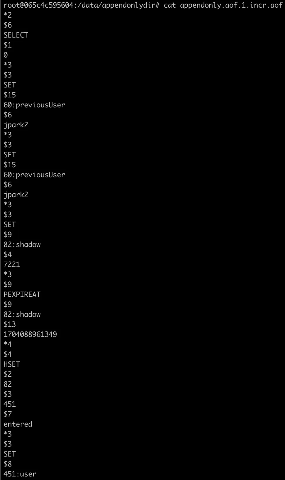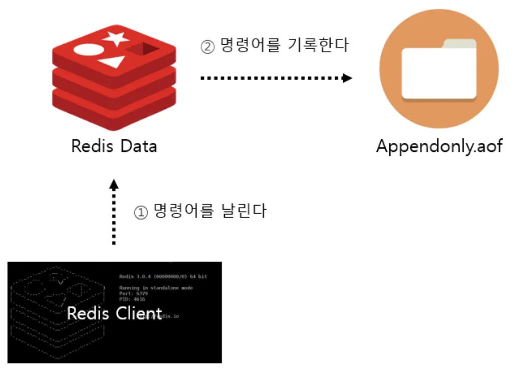AOF 방식은 redis의 모든 write, update 연산 자체를 log파일에 모두 기록하는 형태이다. 조회를 제외한 입력/수정/삭제 명령이 실행될 때마다 default로 appendonly.aof 파일에 기록된다.