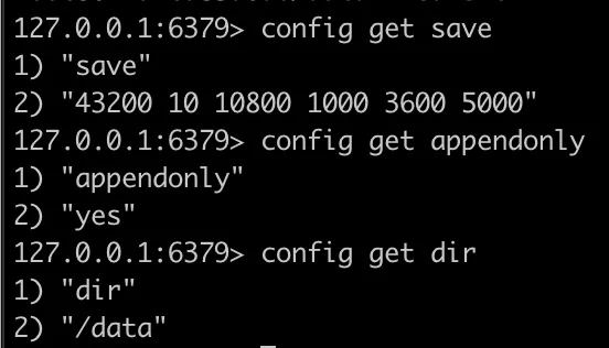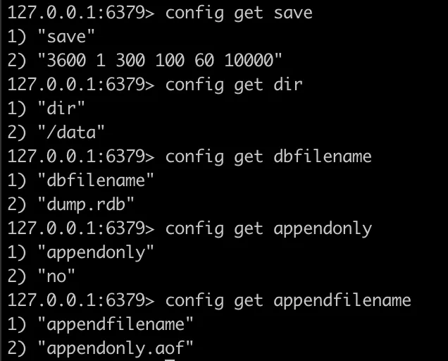 때문에 redis 컨테이너에 들어가서 여러 설정들을 살펴보면, 이처럼 모든 설정값들이 기본값(default)으로 되어있다. 기본적으로 RDB 방식으로 저장하며 /data 디렉토리에 dump.rdb의 이름으로 저장하고, AOF는 설정되어있지 않다.