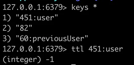 다음으로 TTL(Time To Live)을 확인해 보았는데, key 451:user나 82의 경우에는 애플리케이션 비즈니스 로직으로 처리되는 부분이라 따로 설정이 되어있지 않는 것을 확인했다.