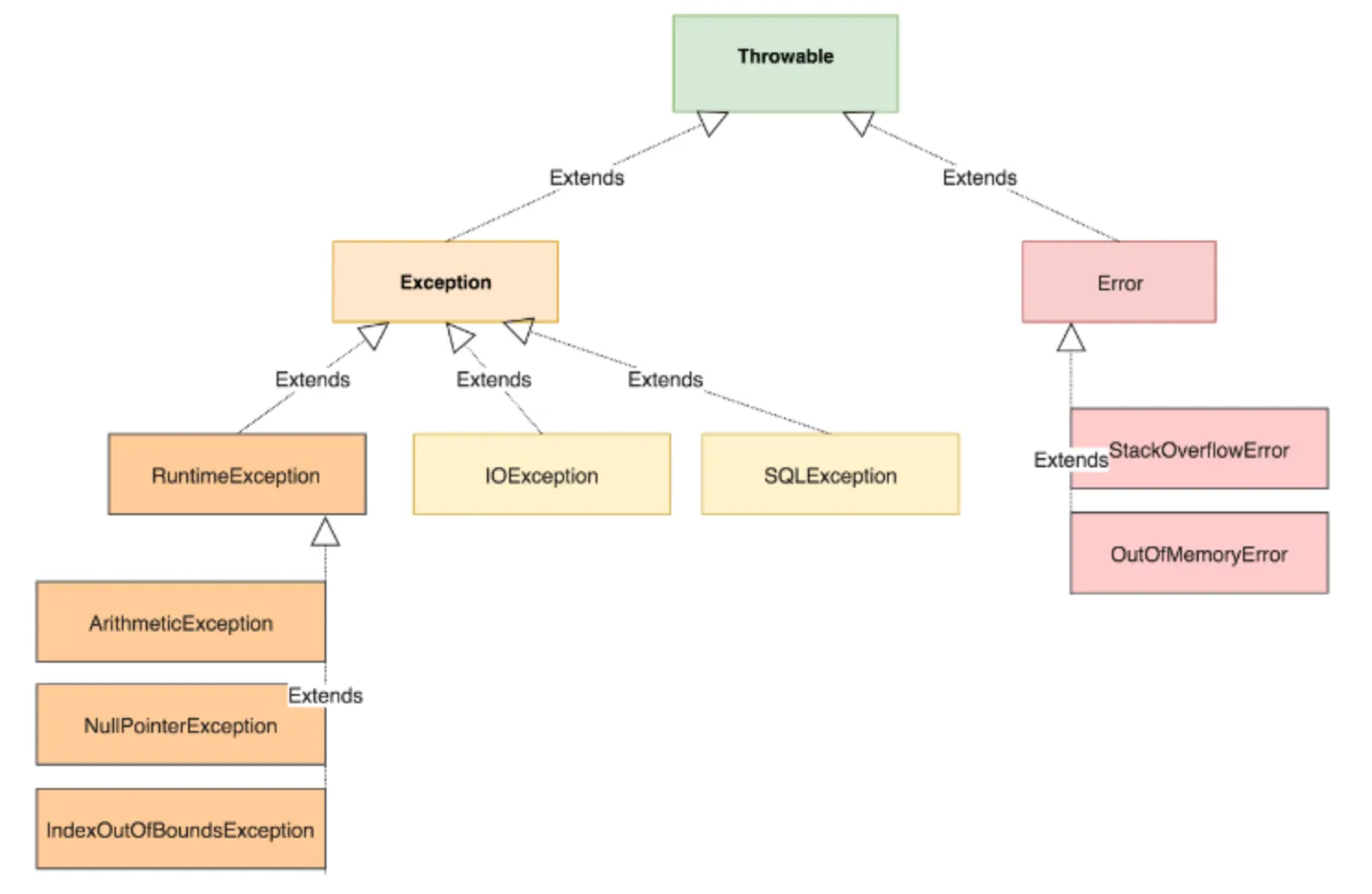 자바에서는 실행 시(runtime) 발생할 수 있는 오류를 에러(Error)와 예외(Exception)으로 구분해두었다.