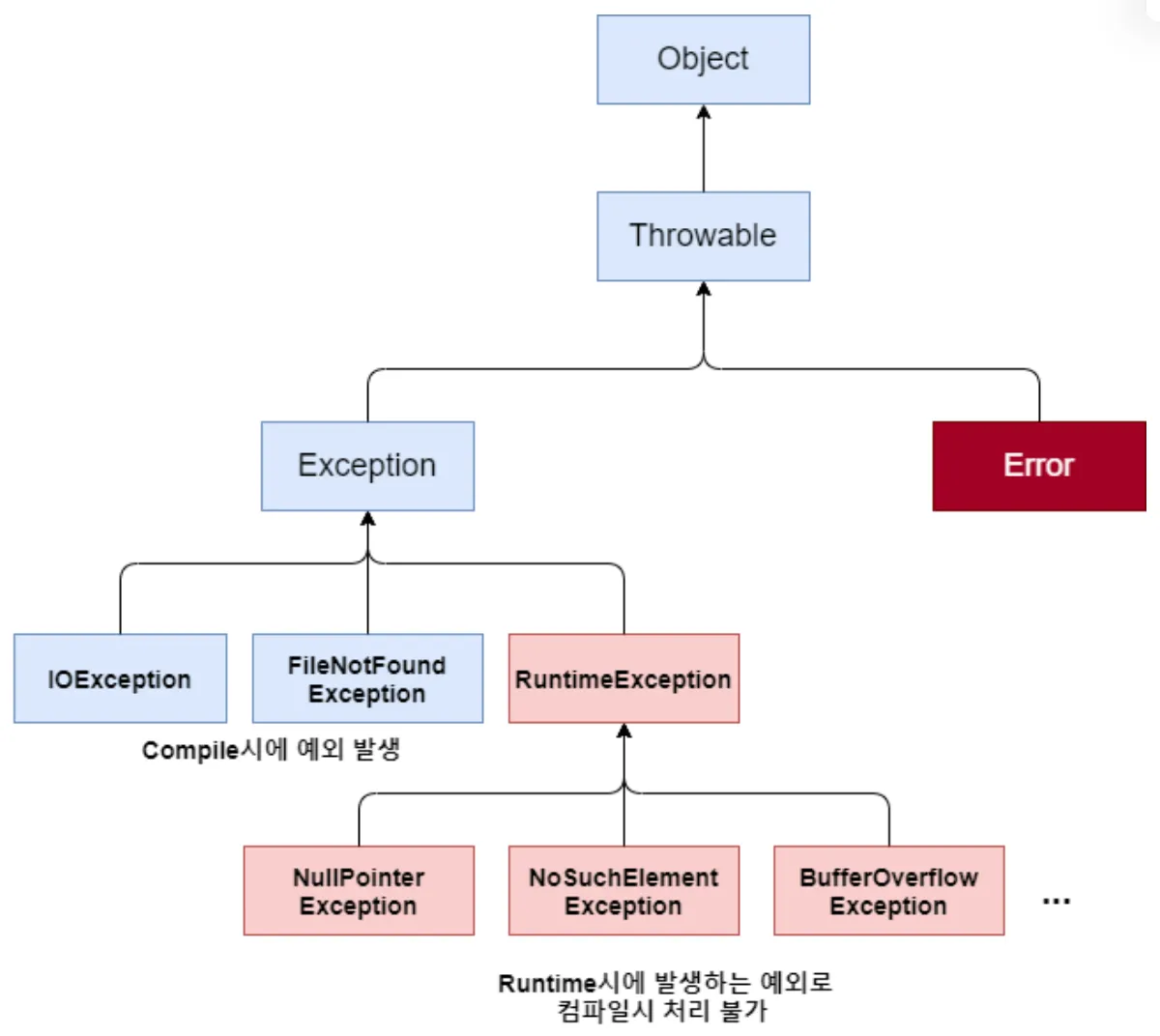 Exception 클래스도 이와 같이 컴파일 에러와 런타임 에러를 따로 클래스로 나뉘게 된다.