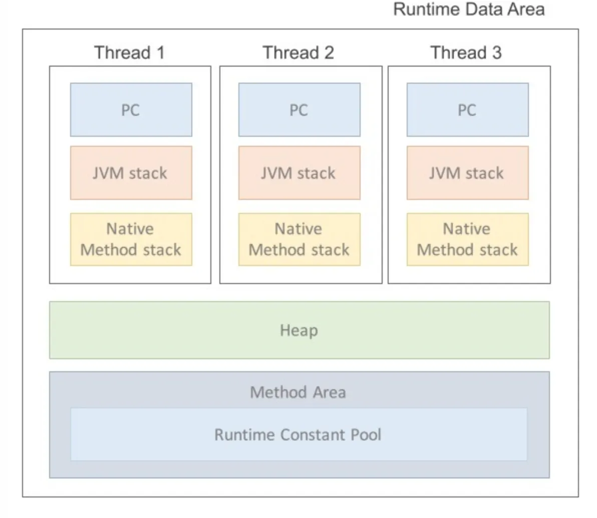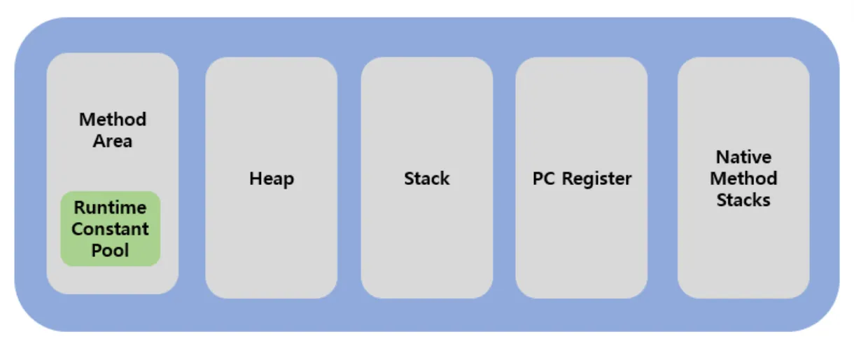 런타임 데이터 영역은 Method 영역, Stack 영역, Heap 영역, PC Register, Native Method Stacks로 나뉘어진다.