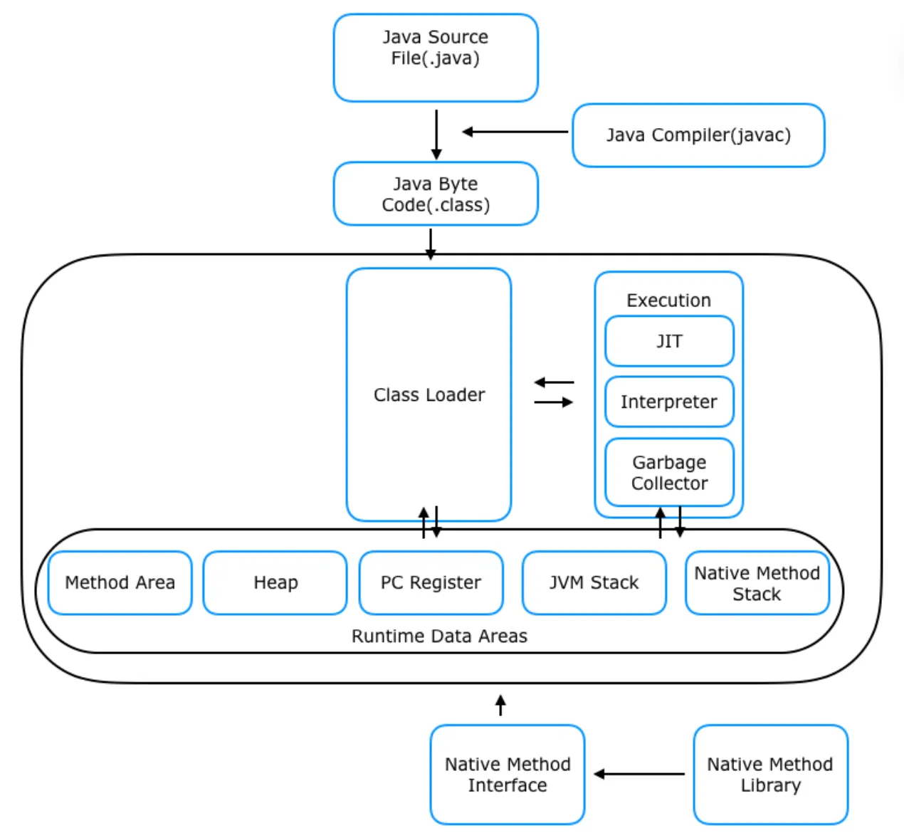 자바 바이트 코드(.class)는 기계가 이해할 수 있는 언어가 아니라 가상머신(JVM)이 이해할 수 있는 중간 레벨로 컴파일 된 코드이다. 이러한 바이트 코드를 인터프리터와 JIT 컴파일러 방식을 통해 실행한다.