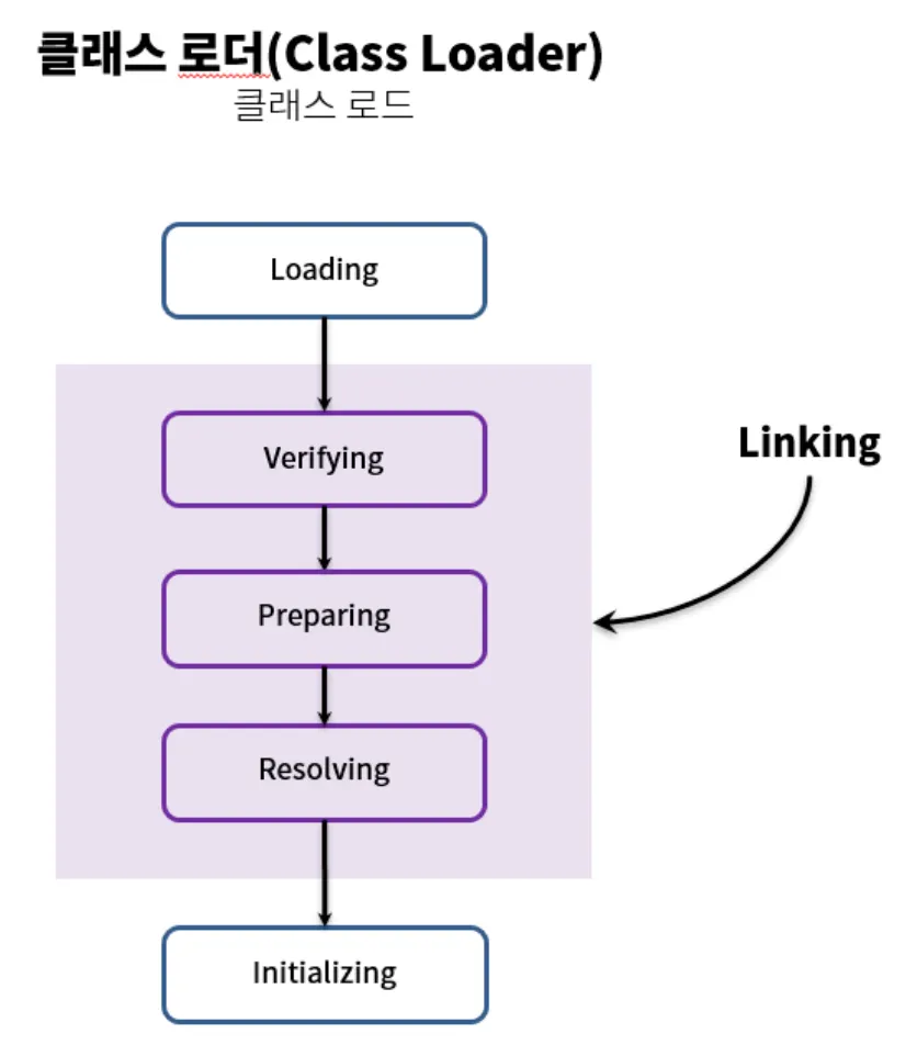 Loaing(로드) : 클래스 파일을 가져와서 JVM의 메모리에 로드