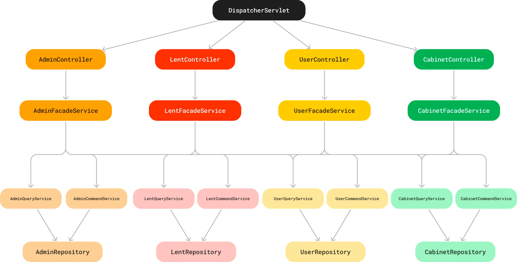 현재 Cabi는 Controller - Service - Repository에 더해, Facade 패턴과 OptionalFetcher를 추가해서 Controller - FacadeService - Service - OptionalFetcher - Repository 구조를 가지고 있다.