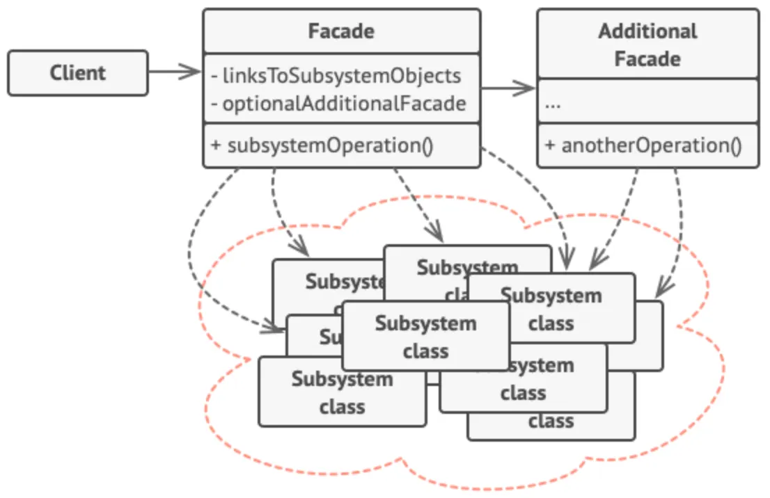 파사드 패턴은 전략 패턴이나 팩터리 패턴과 같은 디자인 패턴과는 달리 클래스 구조가 정형화 되어있지 않다. 클래스를 어디에 두고 어떤 형식으로 위임해야하고 하는 제약이 없고, 파사드 클래스를 만들어 적절히 기능 집약과 의존성 분리를 해주면 파사드 패턴이 되는 것이다.