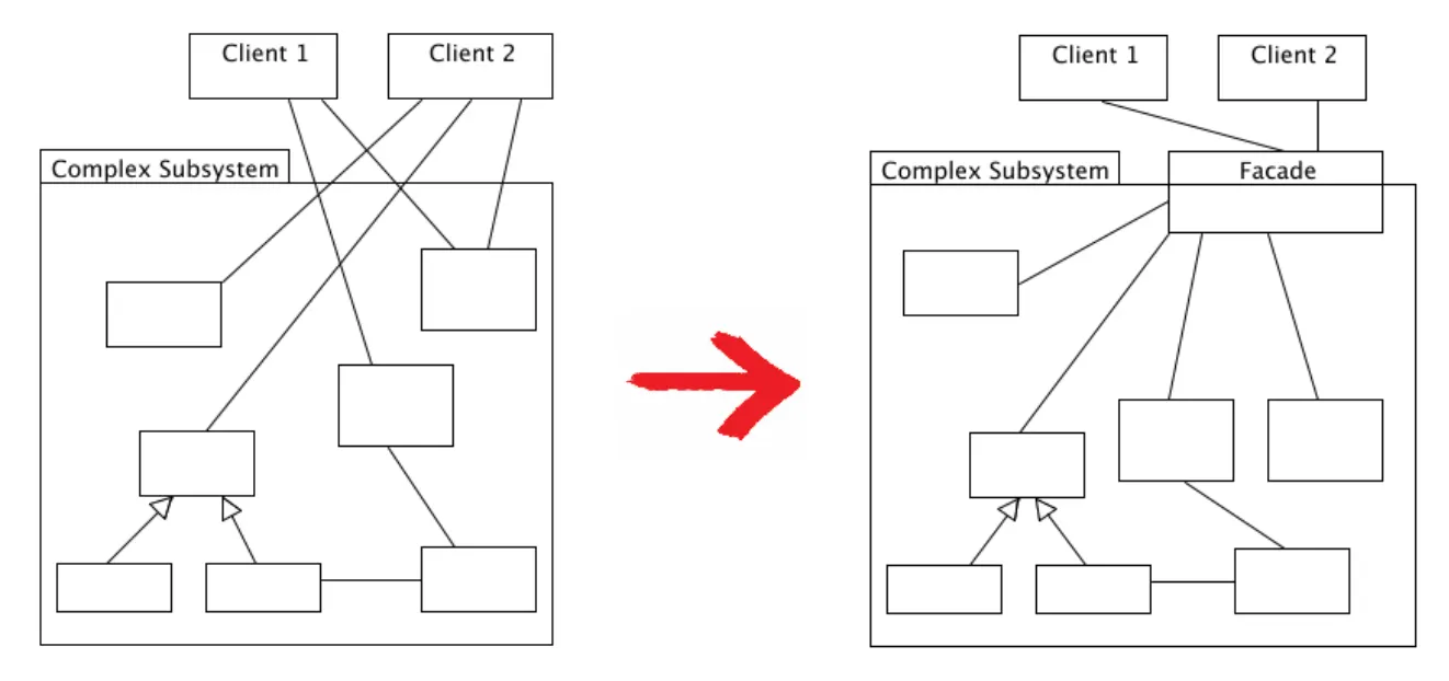 파사드(Facade) 패턴은 복잡한 클래스 구조에 대해 사용하기 편하게 간편한 인터페이스(API)를 구성하기 위한 구조 패턴이다. 예시를 들자면, 라이브러리의 클래스와 메서드가 목적과 동작을 이해하기 어려워 사용하기에 난이도가 높을 때, 적절한 네이밍과 정리를 통해 사용자가 쉽게 라이브러리를 다룰 수 있는 인터페이스를 만드는 것과 같다.