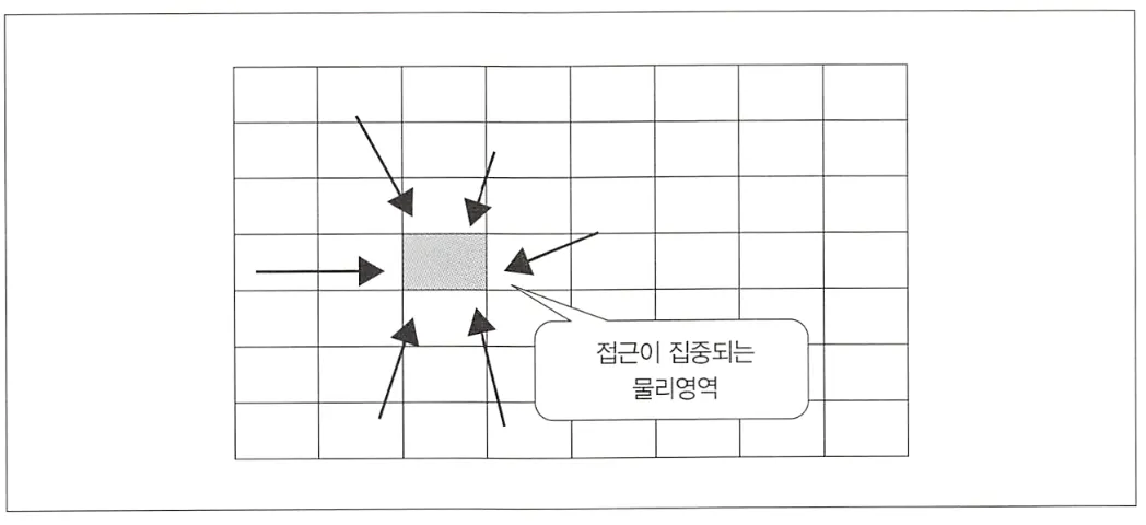시퀀스 객체가 성능 문제를 일으키는 두 번째 경우는 핫 스팟(Hot Spot)과 관련된 문제이다. 순번처럼 비슷한 데이터를 연속적으로 INSERT하면 물리적으로 같은 영역에 저장되는데, 저장소의 특정 물리적 블록에만 I/O 부하가 커져 성능 악화가 발생하고 이를 핫 스팟(Hot Spot) 혹은 핫 블록(Hot Block)이라 부른다.