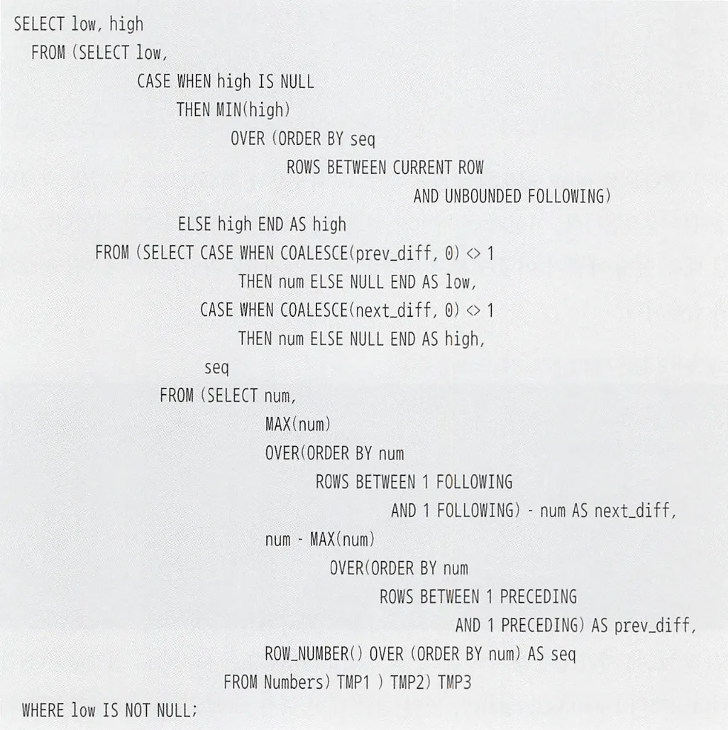 SELECT num + 1, AS gap_start, '~', (num + diff + 1) AS gap_end