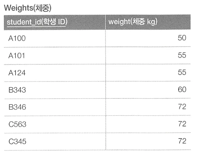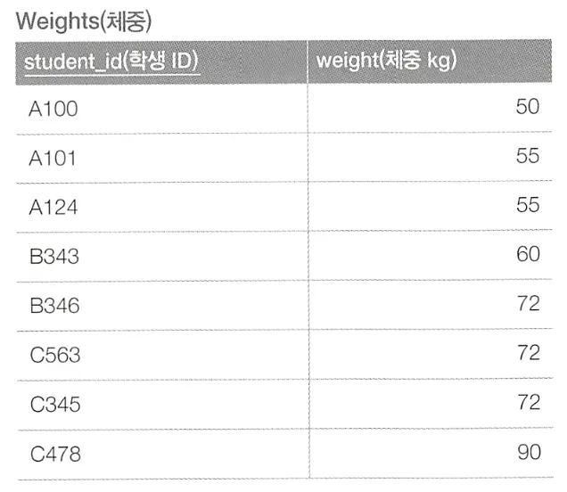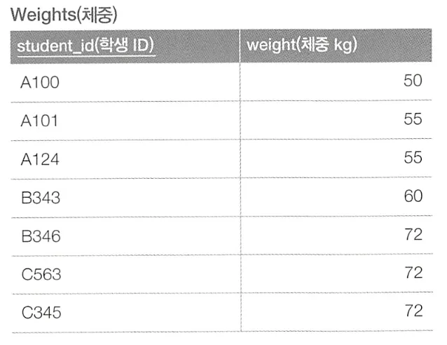 FROM (SELECT W1.weight FROM Weights W1, Weights W2