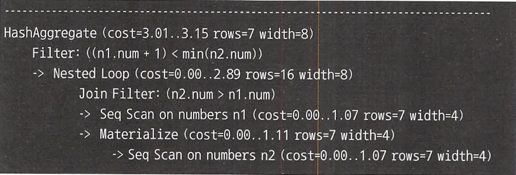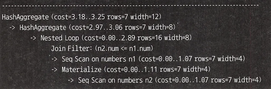 코드도 간단하고 집합 지향적이지만, 실행 계획을 보면 이 역시 자기 결합을 사용하기 때문에 Numbers 테이블에 2번 접근하고 Nested Loops로 결합이 발생해 비용이 높다.