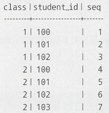 ROW_NUMBER() OVER (ORDER BY class, student_id) AS seq