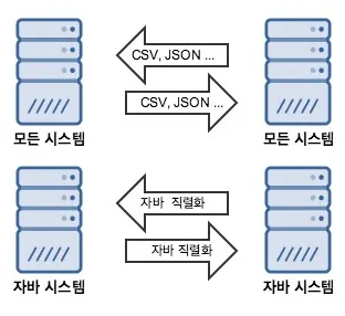 직렬화는 다른 시스템에서는 사용하지 못하더라도, 별다른 파싱 작업 없이 다른 자바 시스템에서 역직렬화하여 바로 사용할 수 있다.
