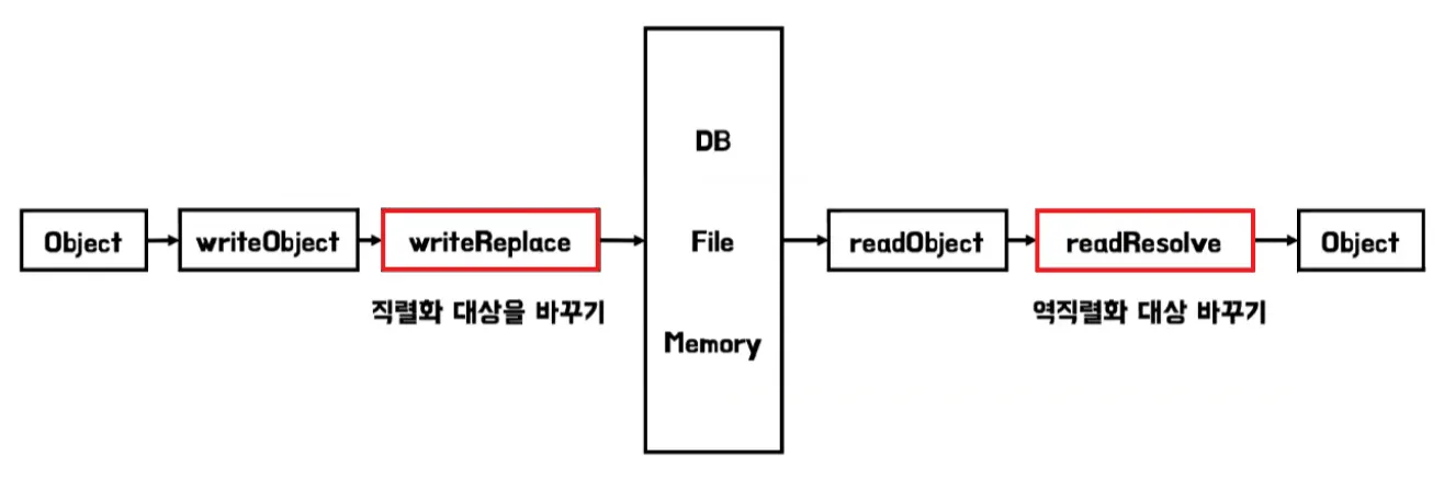 // 객체를 직렬화 할때 호출되어, 직렬화 대상을 writeReplace를 통해 프록시를 반환하도록 제어