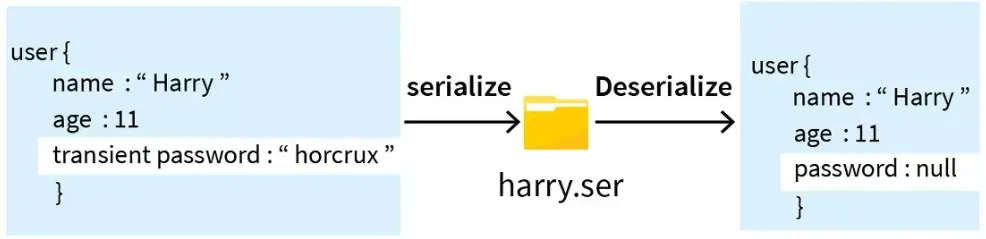 객체를 직렬화할 때 객체의 모든 인스턴스를 직렬화하기에는 너무 무겁거나 중요한 정보는 외부에 노출시키고 싶지않다면, transient 키워드를 통해 직렬화 대상에서 제외되도록 할 수 있다.