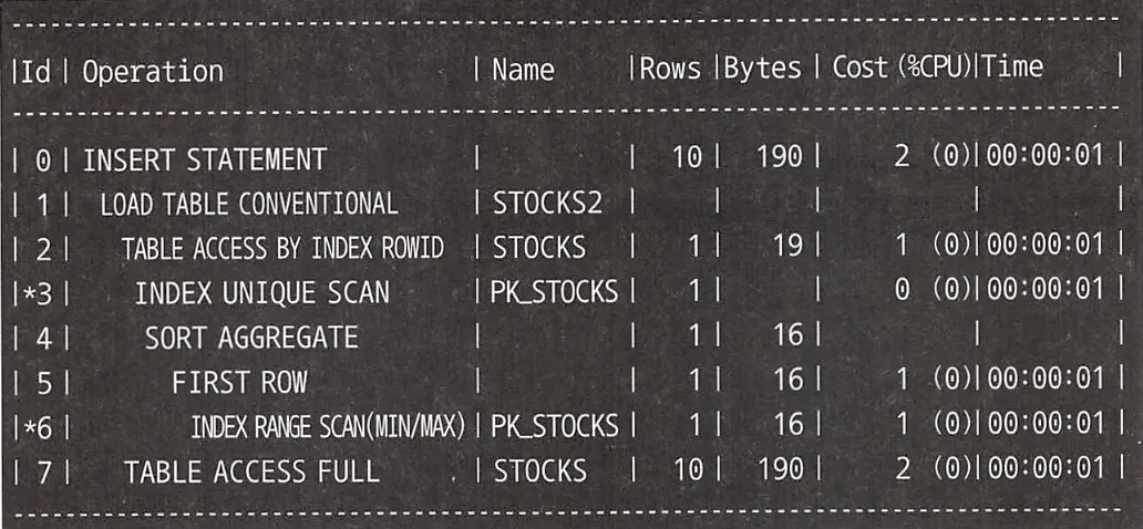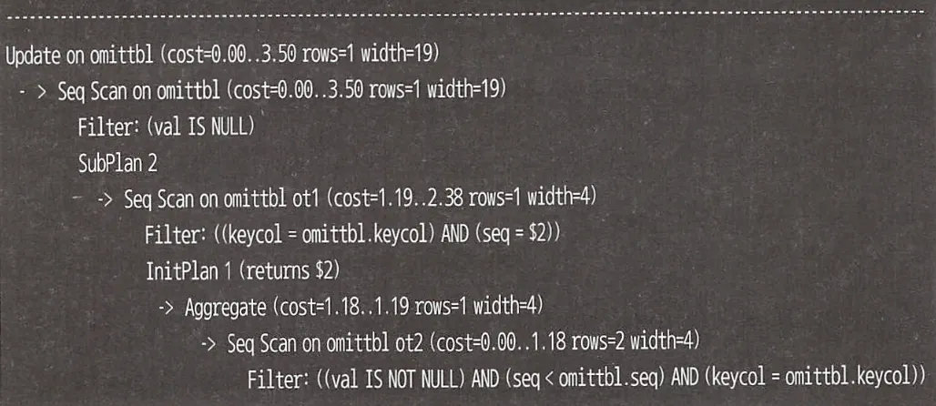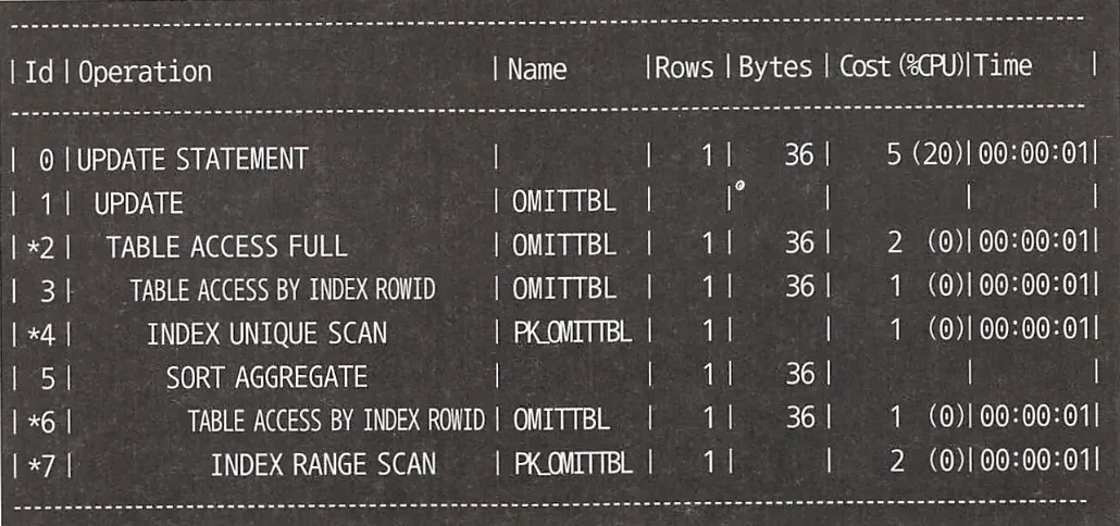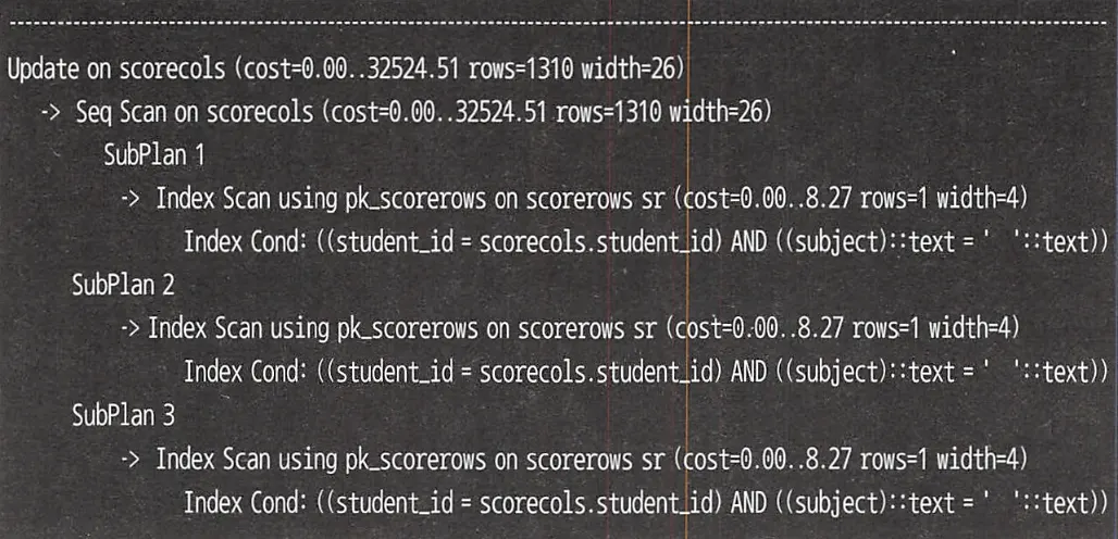 Oracle에서 보면 기본적으로 테이블 풀 스캔을 사용하지만, 내부의 2개의 서브쿼리는 기본 키 인덱스를 사용하는 것을 확인할 수 있다. PostgreSQL도 데이터양이 늘어난다면 이와 같이 인덱스를 사용해 실행 계획을 만들 가능성이 크다.