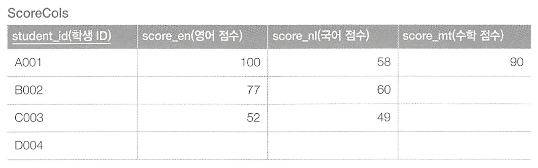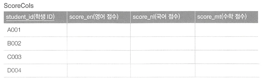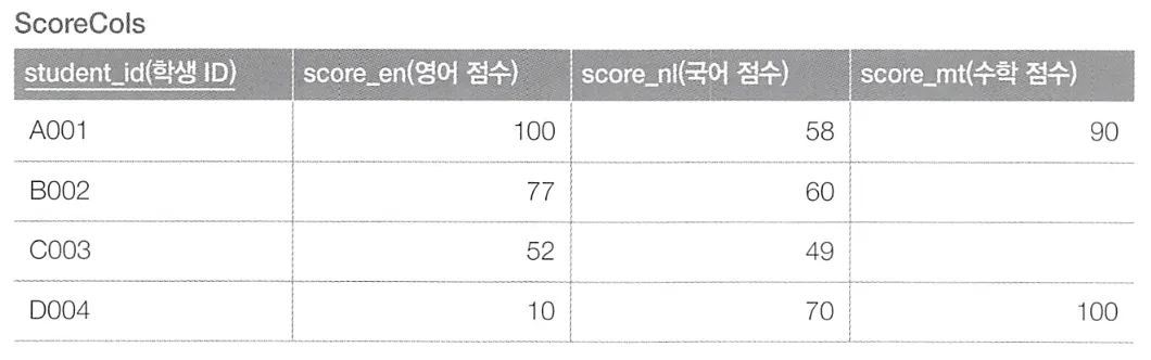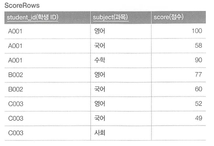 여기서 중요한 것은 국어, 영어, 수학이라는 세 개의 필드를 리스트 형식으로 지정하여 한번에 처리하는 다중 필드 할당과, 서브쿼리에서 MAX 함수를 각각 적용하여 집약한다는 것이다. 서브쿼리를 집약하지 않으면 여러 개의 레코드가 리턴되어, (100, NULL, NULL)과 같이 3개의 값이 리턴된다.