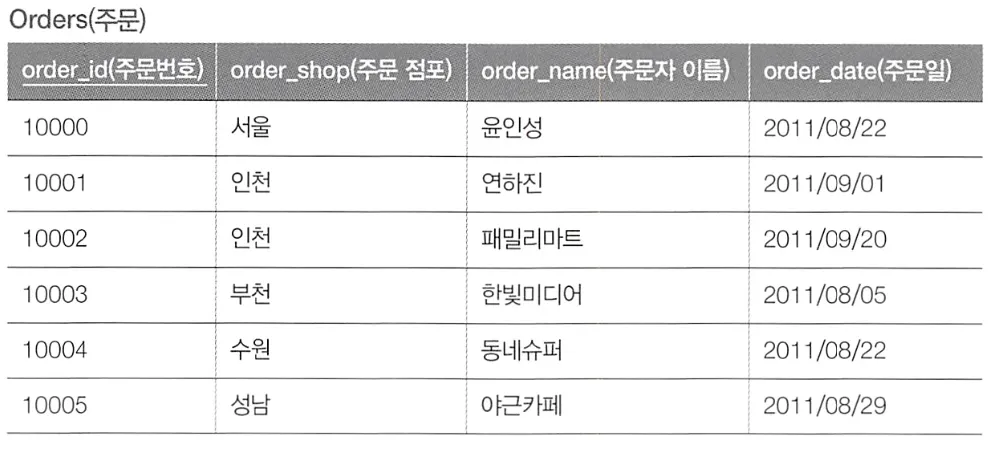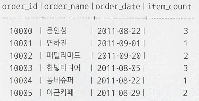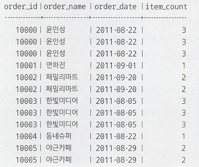 결과 필드에 주문 번호, 주문자 이름, 주문일, 상품 수를 포함하는 결과를 구하고자 한다.