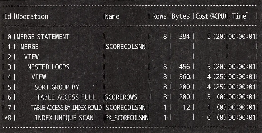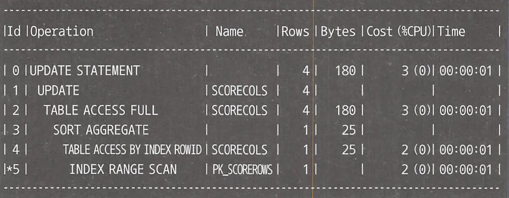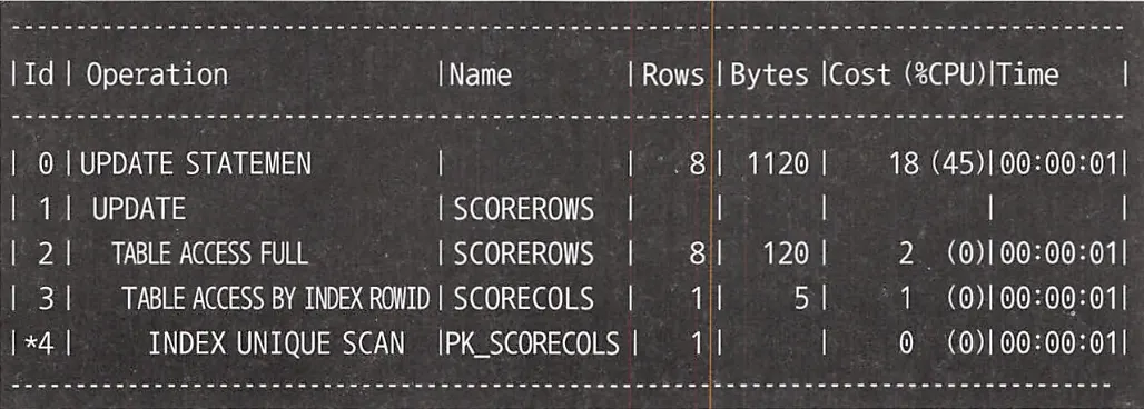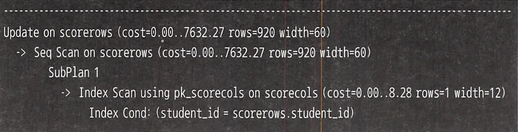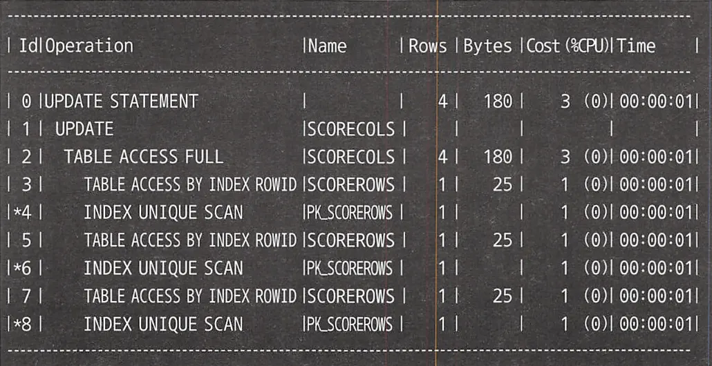 실행 계획을 보면 테이블 풀 스캔 1회와 정렬 1회가 발생한다. 이는 갱신할 필드가 많아져도 변하지 않아, 상관 서브쿼리와 달리 성능이 악화될 여지가 없다. 또한 ScorecolsNN 테이블과 ScoreRows 테이블의 결합도 1회만 발생하므로 EXISTES를 사용하는 것보다 나을 수 있다.