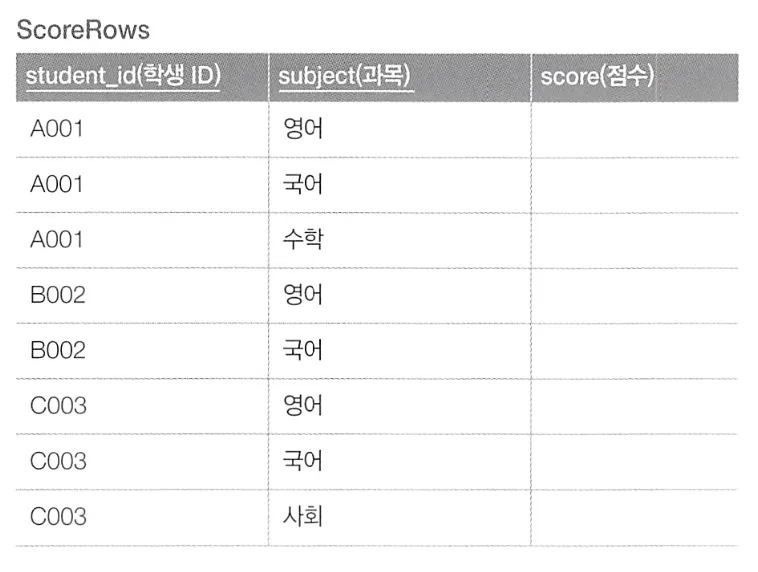 대신 ScoreRows 테이블에 대한 검색이 INDEX UNIQUE SCAN이 아니라 INDEX RANGE SCAN이 사용되는 것을 볼 수 있다. 다만 학생당 과목 수가 그리 많지 않을 것이기 때문에, 서브쿼리를 줄이는 것이 훨씬 효율적인 트레이드 오프이다.