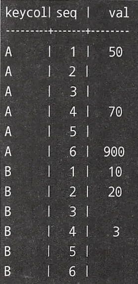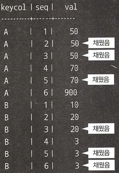 이와 같은 테이블에서, val 필드에 NULL 값 대신 같은 keycol의 이전 seq의 val 값을 그대로 저장하여 아래와 같이 만든다고 하자.