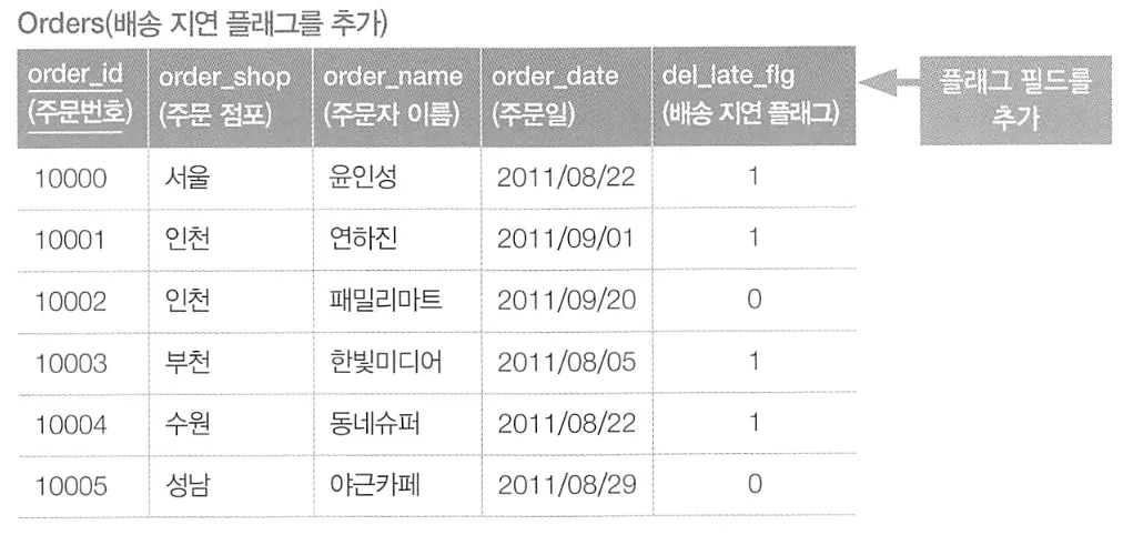 위의 방법은 결합 및 집약을 통한 SQL 구문이기 때문에 실행 계획의 변동 리스크가 크다. 사실 이 문제는 SQL을 사용하지 않고도 해결할 가능성이 있다. 테이블 구성(ER 모델)을 변경할 수 있다면, 배송이 늦어질 가능성이 있는 주문의 레코드에 플래그 필드를 Orders 테이블에 추가하여 간단하게 해결할 수 있다.
