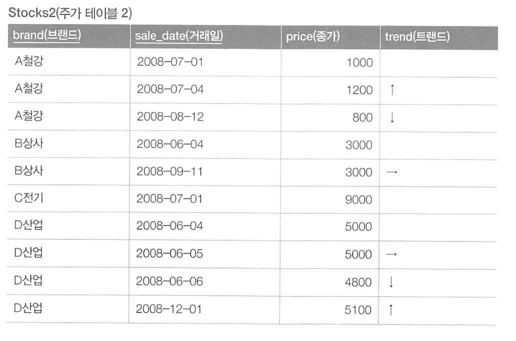 이와 같은 테이블에서, 같은 브랜드의 거래일에 따른 변화 trend(트렌드) 필드를 추가하여 아래와 같이 작성하고자 한다.