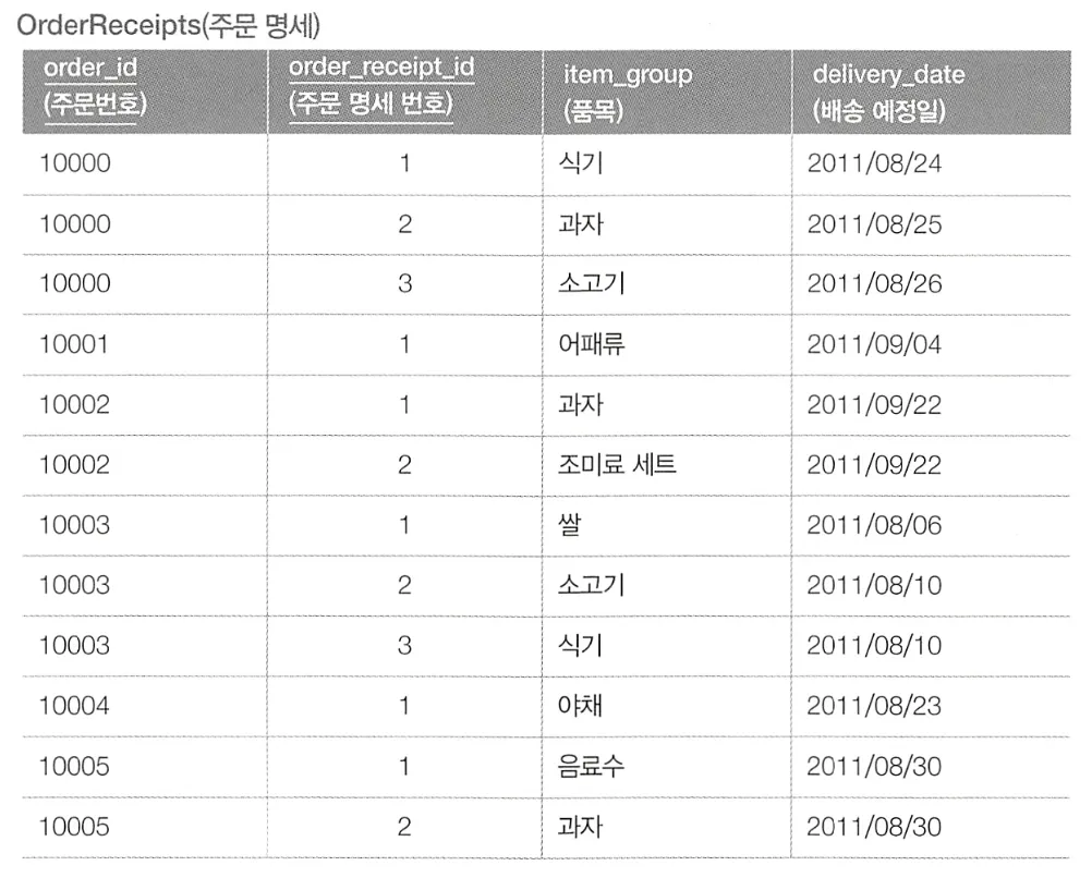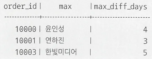 여기서 order_name의 MAX 함수는 날짜 차이의 최대값을 구하기 위한 집약 함수이고, delivery_date - order_date의 MAX 함수는 최대값이 아닌 값을 선택하기 위한 함수로 MIN을 사용해도 무방하다.