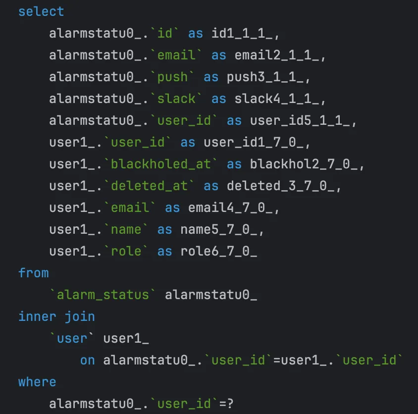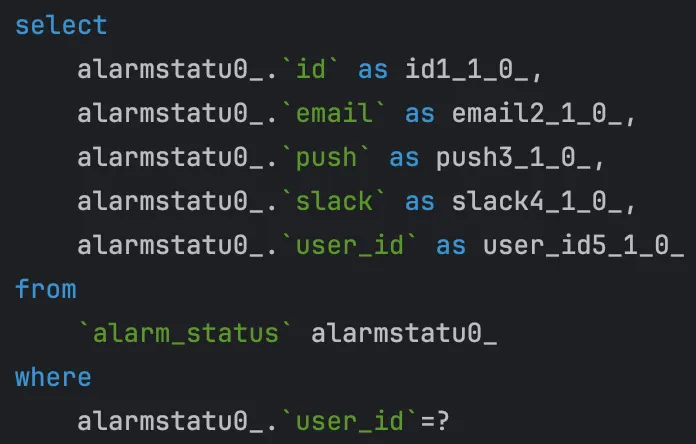 위 로직을 보면 alarmStatus를 조회하거나 값을 가져다가 사용하는 일이 전혀 없다. 로직을 디버깅 해보면 getUser를 할 때, alarmStatus를 조회하는 쿼리를 수행한다.